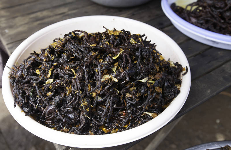 Want to get over your fear of spiders? How about eating them for lunch? Tarantulas were first introduced as food under the communist regime in the country in the 70s, when people were starving and had nothing else to eat. This became more and more popular, and today you will be served deep fried tarantulas all over Cambodia. It is said that they taste a bit like crab.
